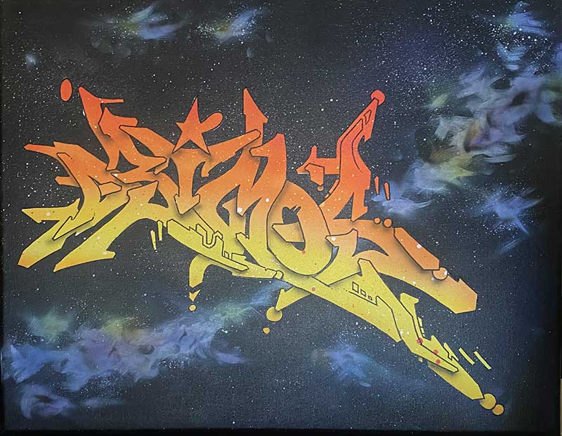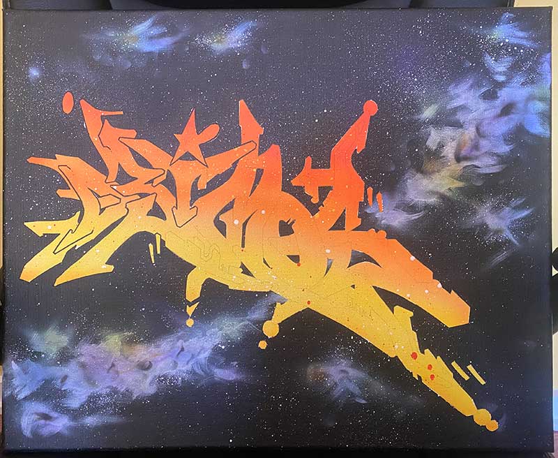 Started by laying down a black background with some acrylic. Then bushed up some spacey nebulistic gasses and matter.