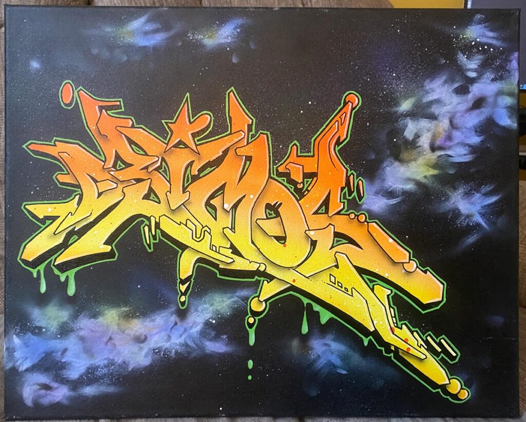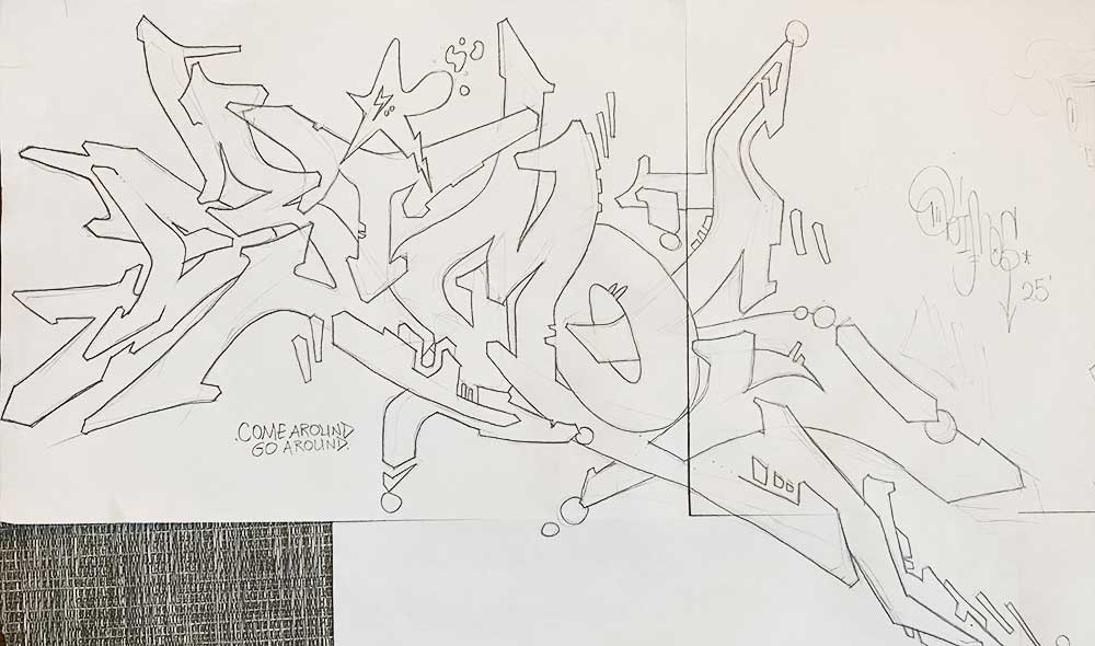 1.) Transposed the sketch onto a white 20″ x 16″ canvas. Masking taped off the graff part.