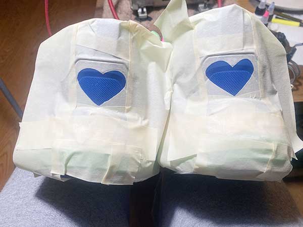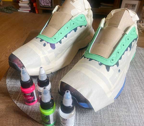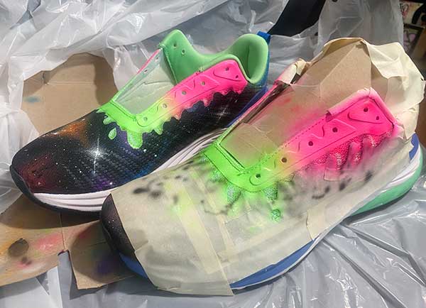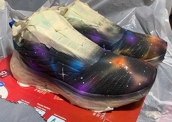 2.) Once masked off, I hit em’ with the black back foundation, and then layer white in the areas where I want color to reside. Finished it off with some flicks and spritz of white